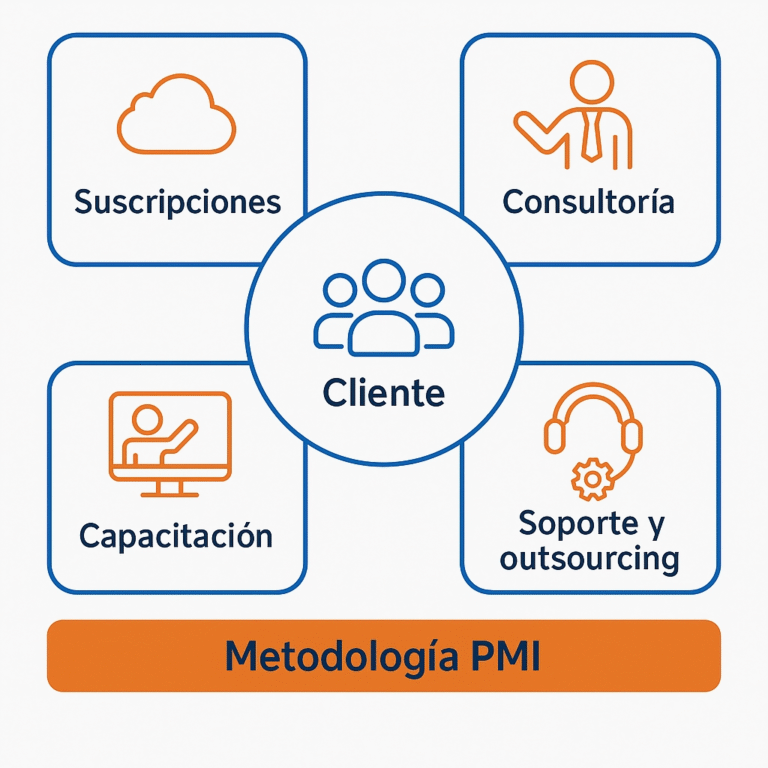 Nuestra metodología se basa en estándares PMI, asegurando la entrega en tiempo, forma y con calidad.